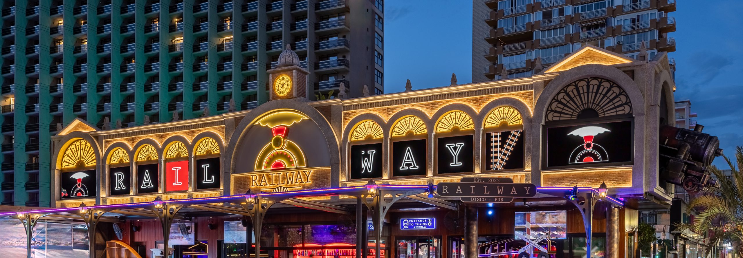 Situado en el corazón de Benidorm, el Pub Railway se convirtió en un reto para nosotros desde el principio. Ambientado en una antigua estación de trenes, en tan solo 3 meses, conseguimos crear uno de los pubs más distinguidos actualmente en Benidorm. En cada uno de los espacios se pueden observar diferentes elementos que te trasladan a otra época, destacando en gran parte su espectacular fachada.