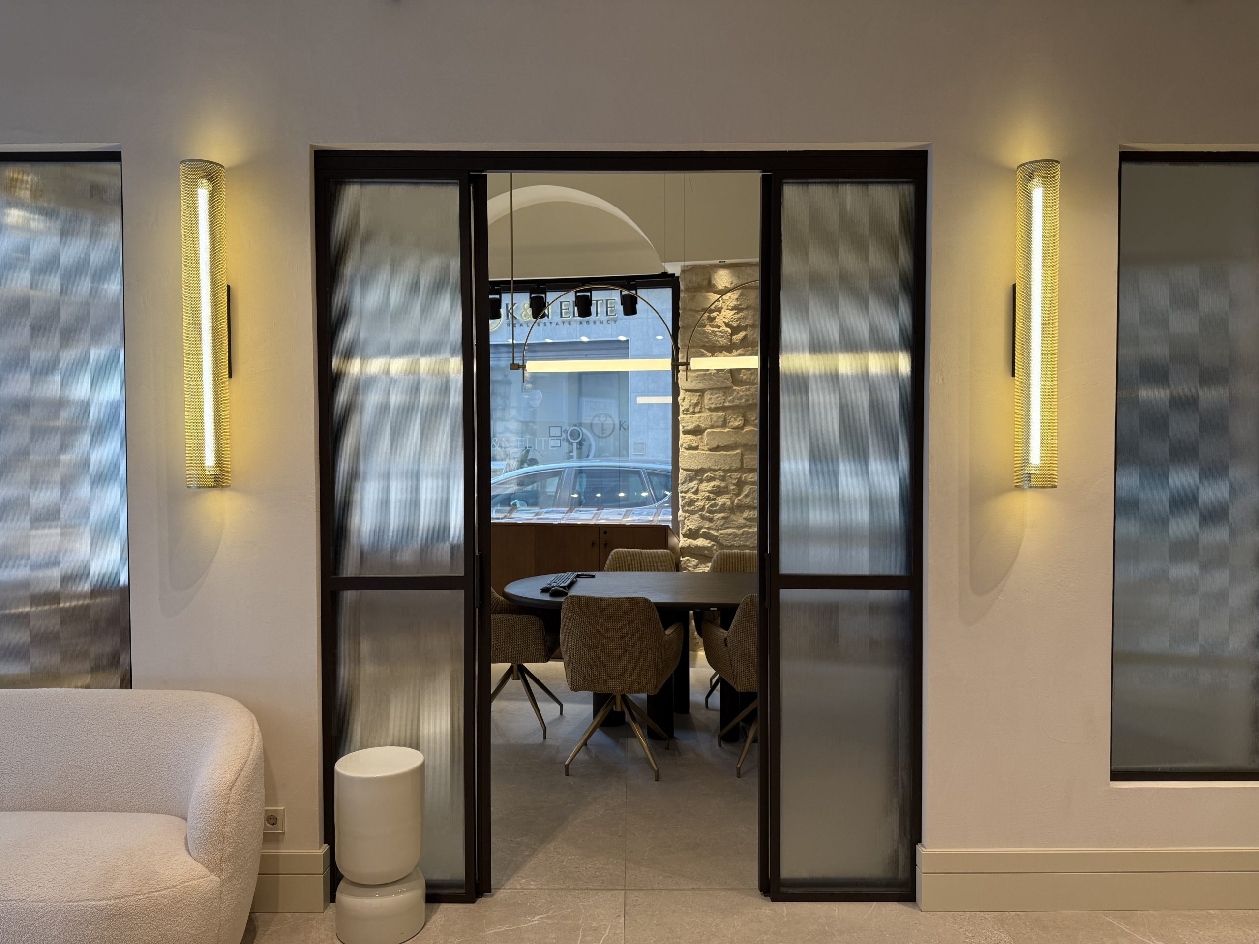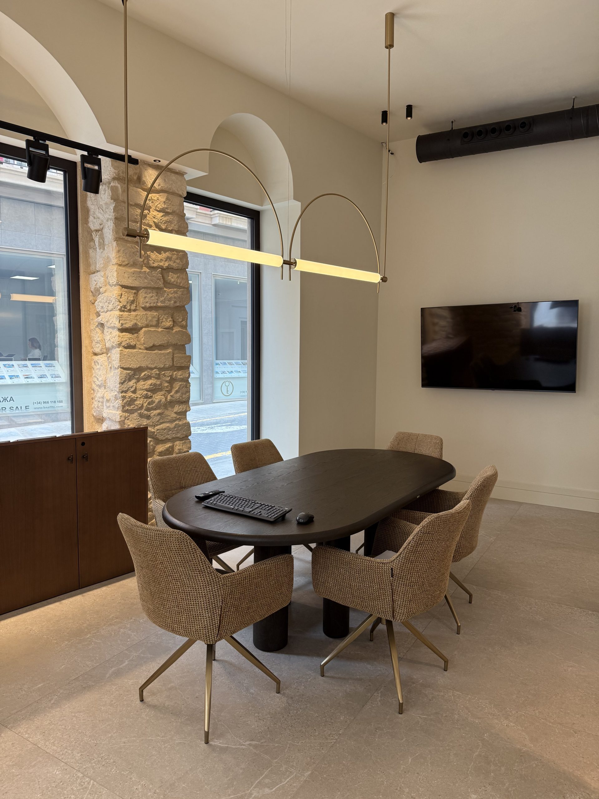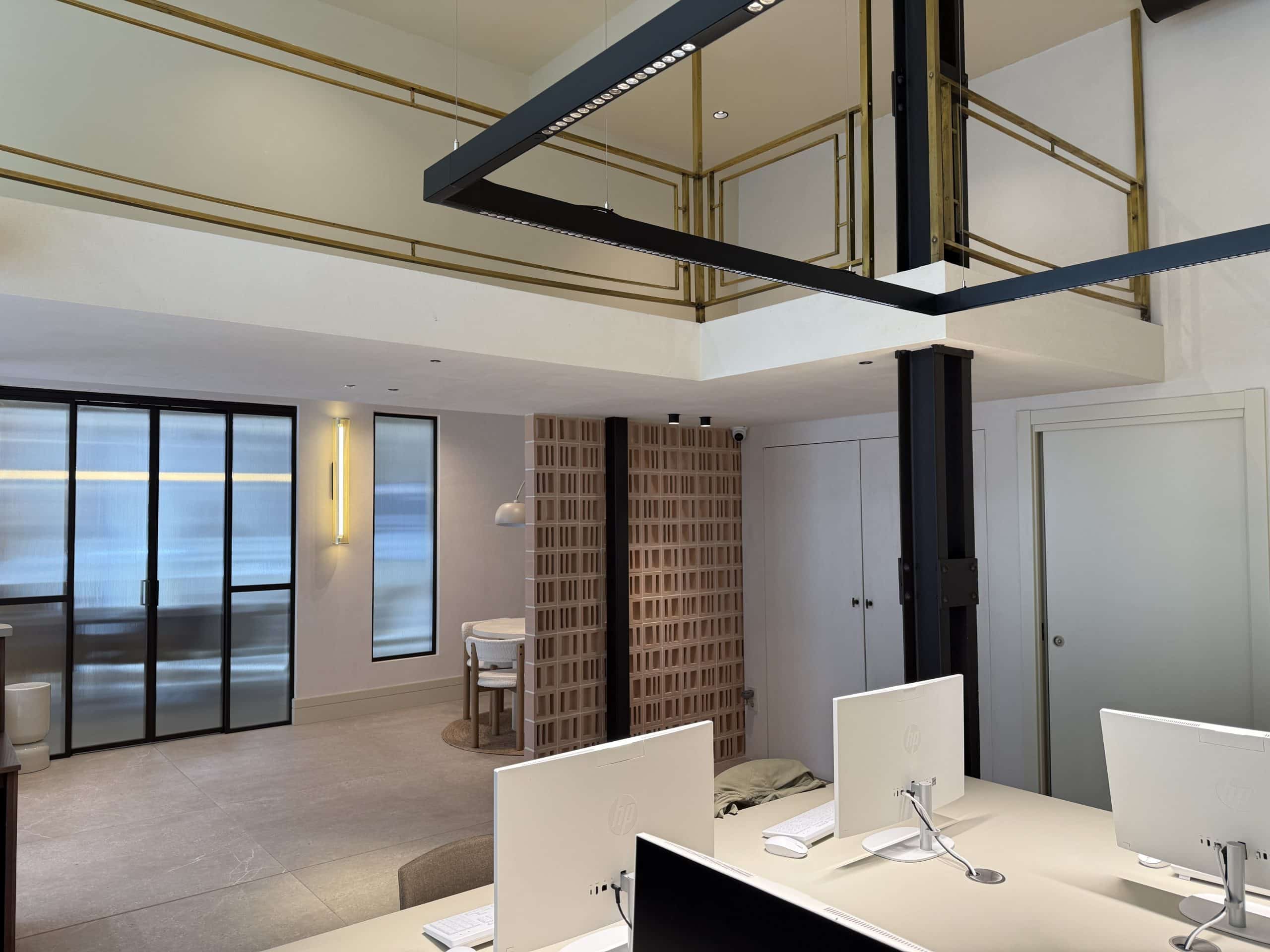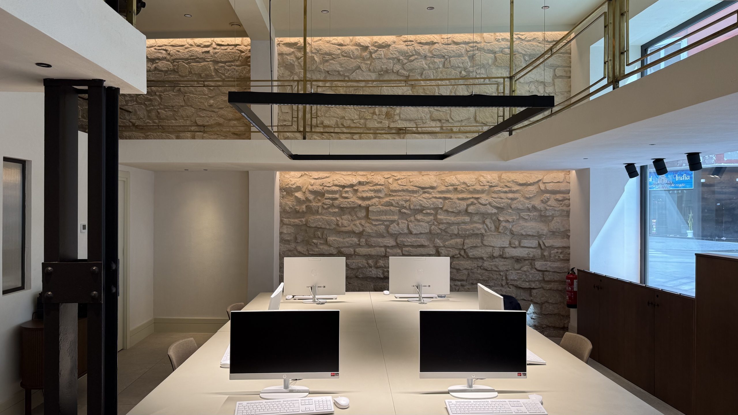 El proyecto combina materiales nobles, iluminación cálida y una paleta neutra que potencia la sensación de amplitud y elegancia. Cada elemento —desde el mobiliario a medida hasta la señalética— fue cuidadosamente seleccionado para transmitir la imagen de una empresa sólida y sofisticada, pero cercana.