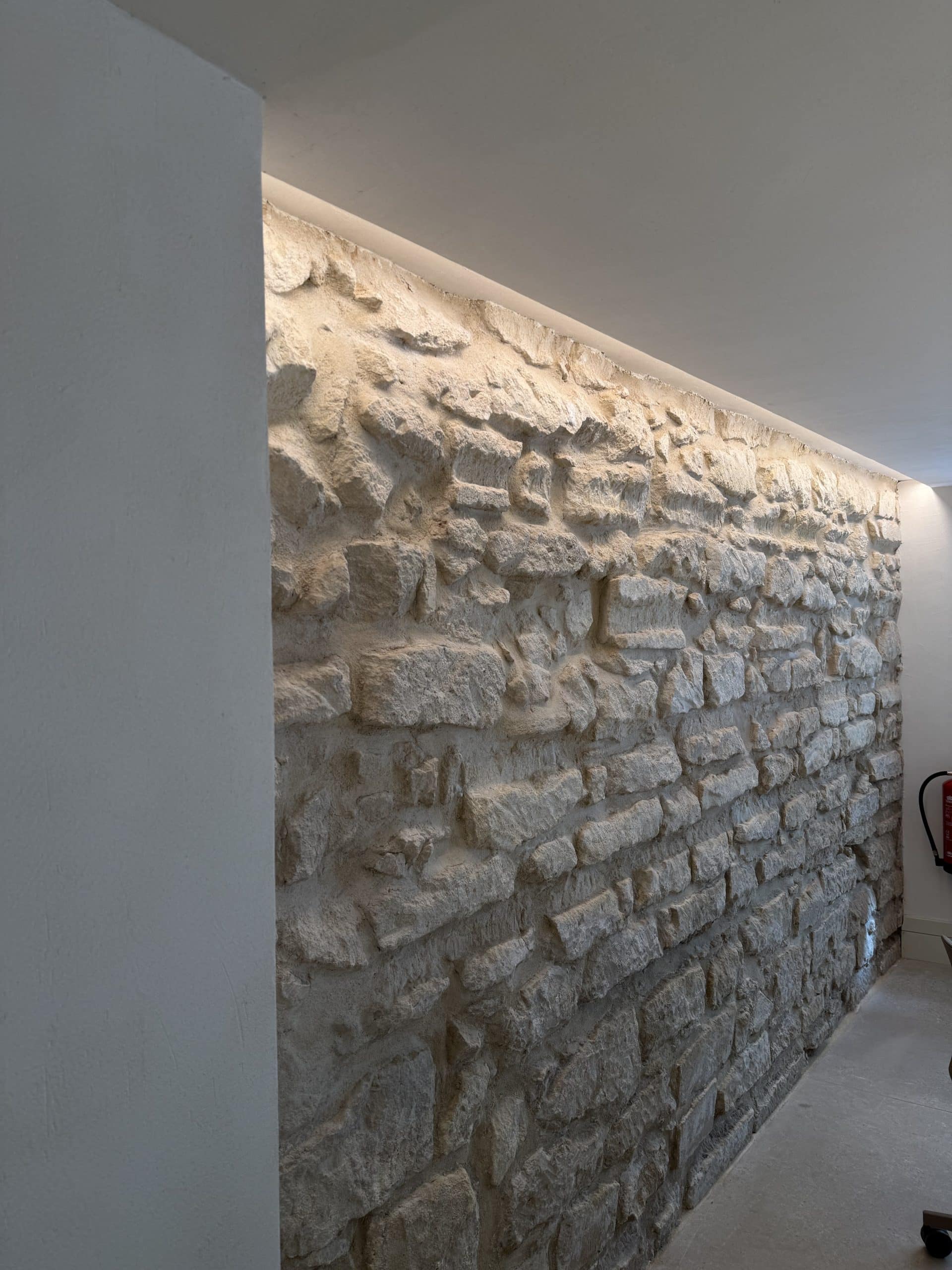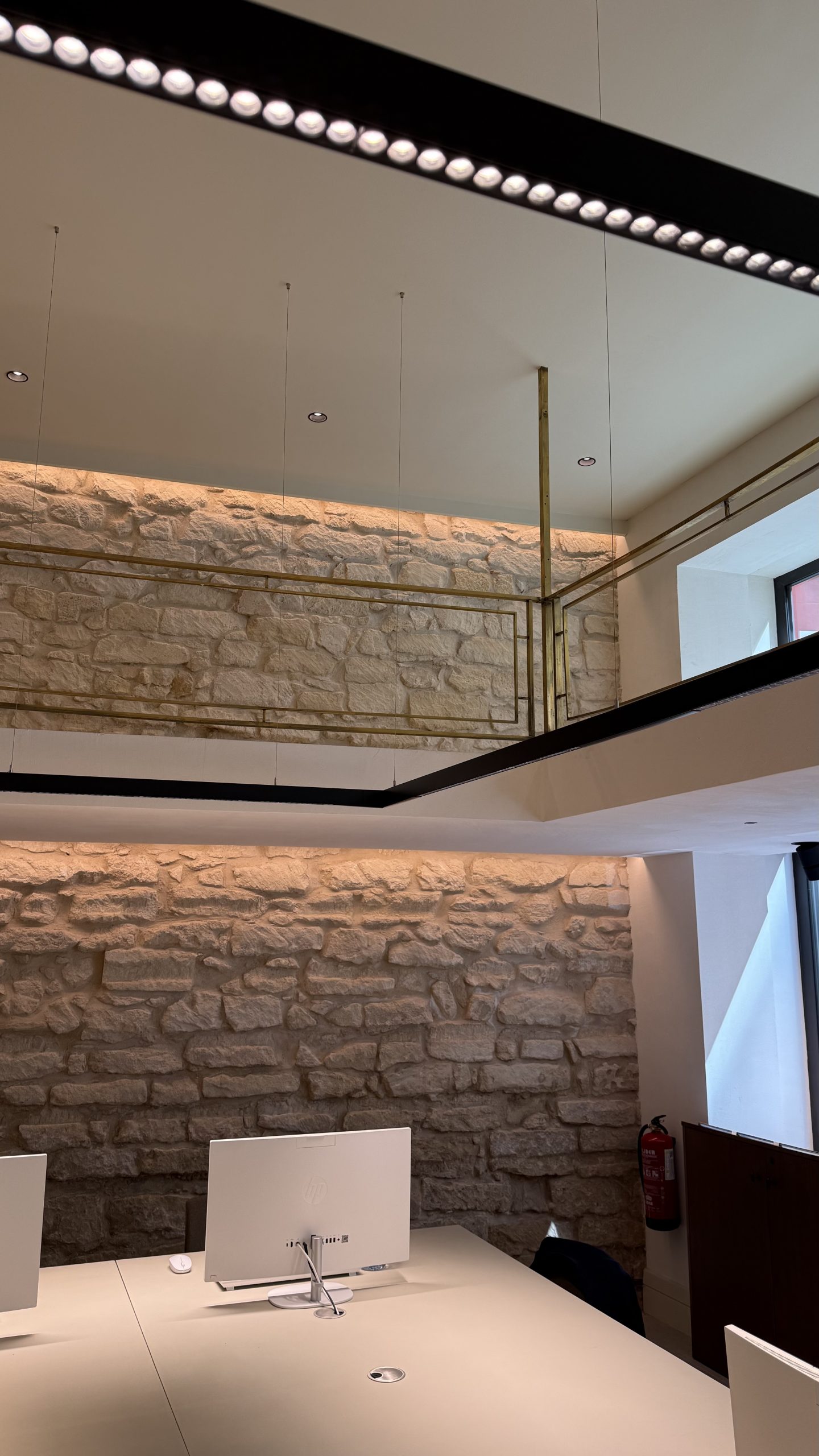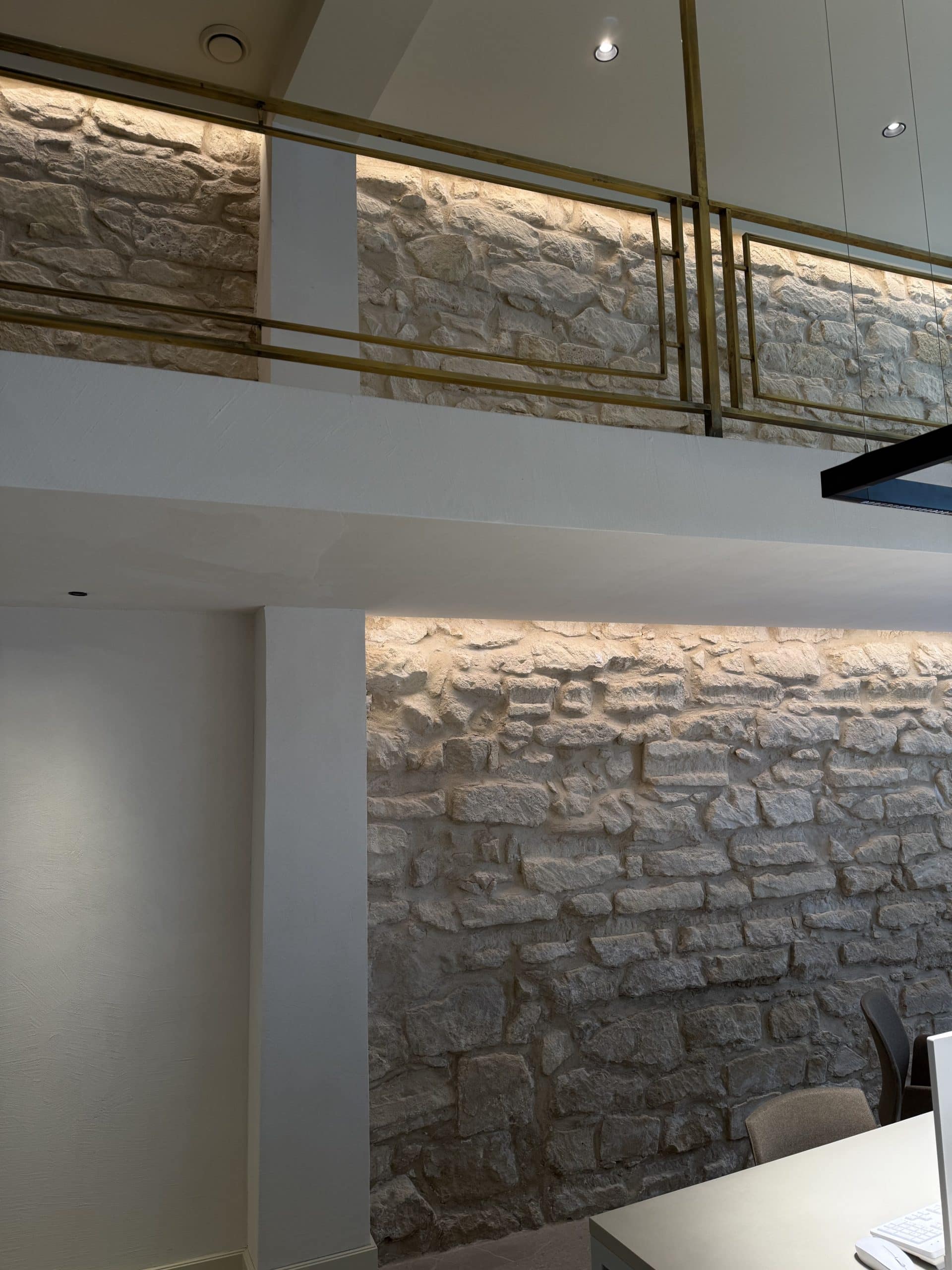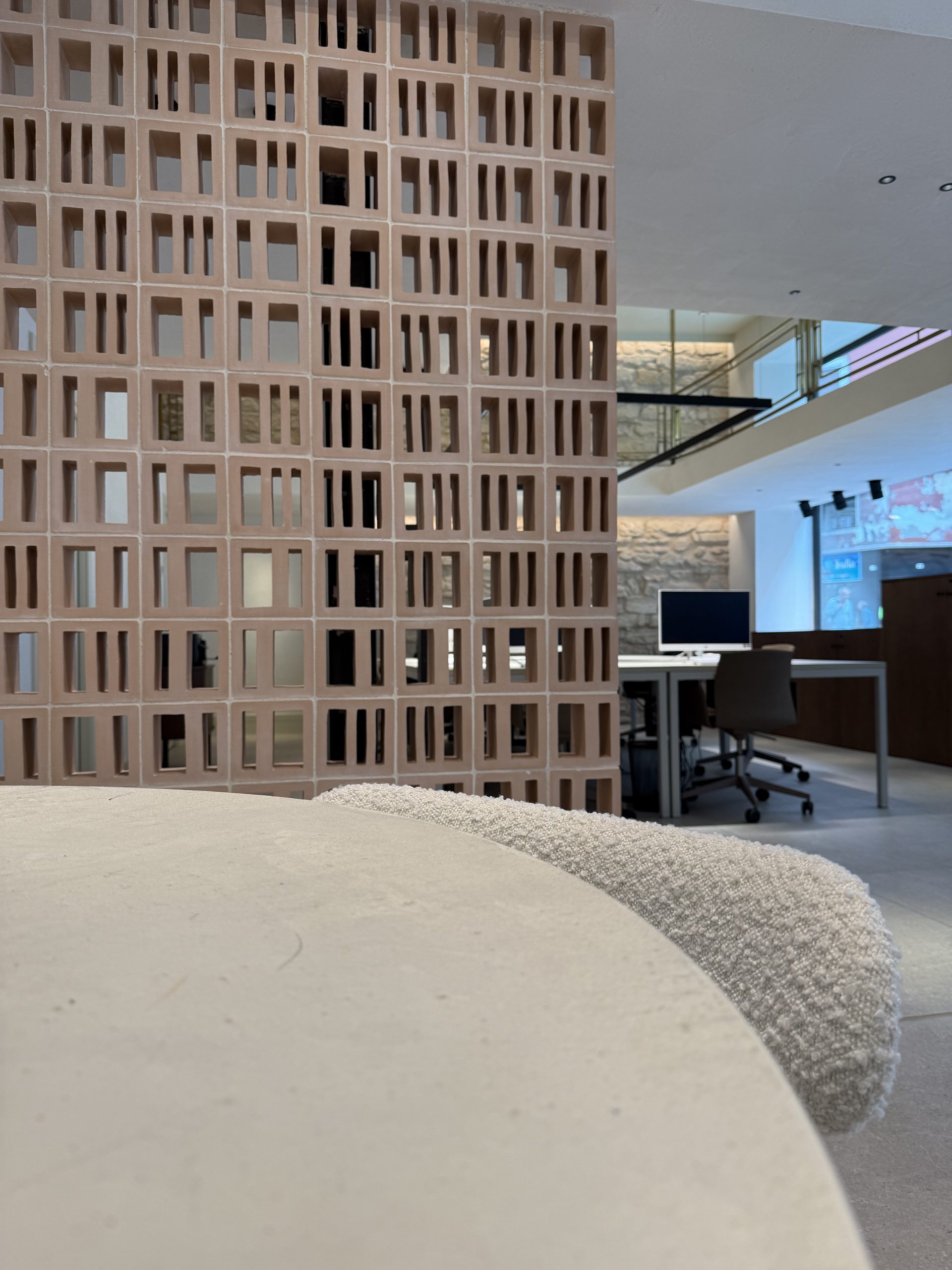 El proyecto combina materiales nobles, iluminación cálida y una paleta neutra que potencia la sensación de amplitud y elegancia. Cada elemento —desde el mobiliario a medida hasta la señalética— fue cuidadosamente seleccionado para transmitir la imagen de una empresa sólida y sofisticada, pero cercana.